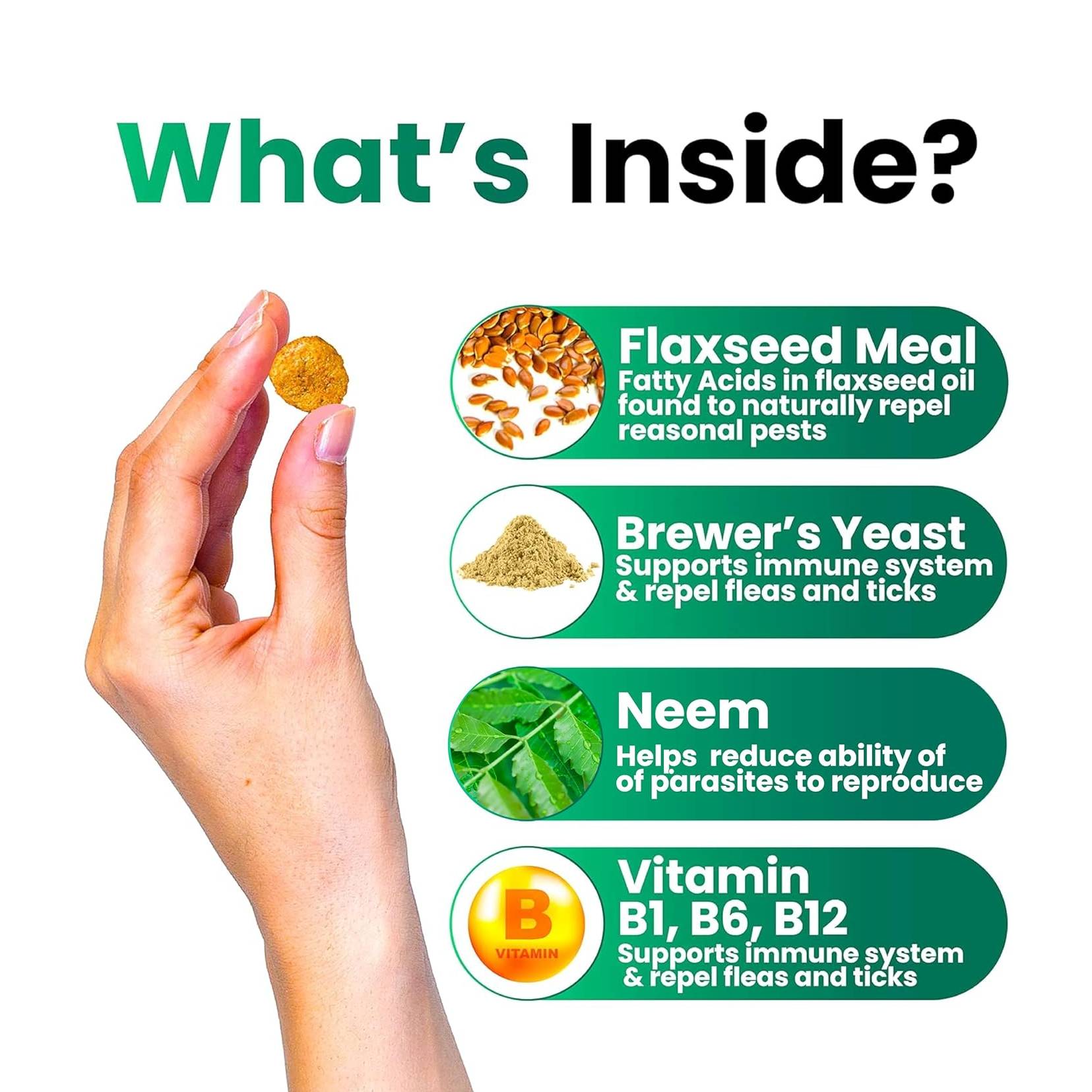 Each chew delivers a powerful blend of natural ingredients like neem, brewer’s yeast, coconut, and garlic extract that help strengthen your dog’s skin barrier and make them less attractive to pests.